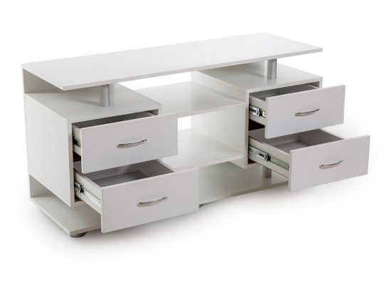 Удобная телевизионная тумба с открытыми полками для аудио/видео-аппаратуры, закрытыми полками и вместительным выдвижным ящиком.