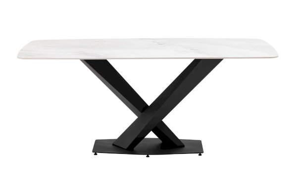 Столешница сочетает в себе прочную керамику, материал устойчивый к перепадам температуры, к чрезмерной влаге, любые загрязнения легко устранить. Поверхность повторяет рисунок изысканного мрамора, излучая комфорт и спокойствие. Каркас черного матового цвета изготовлен из прочного и долговечного МДФ. Основание из двух объёмных балок образует простую и надежную конструкцию. Роскошное сочетание цветов позволяет подобрать к столу любые комплекты стульев в современном стиле.