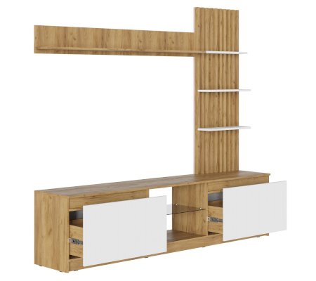 Конструкция выдвижных ящиков усилена дополнительным ребром жесткости, это обеспечивает надежность эксплуатации Выдвижные ящики не имеют ручек, открывание происходит за фасад с помощью специальных зазоров. Зазоры прикрыты декоративными планками Ниша под телевизором оборудована стеклополкой из тонированного стекла в цвете Графит, края обработаны еврокромкой Технология обработки торцов «Full circle ECO»