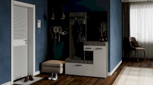 Небольшая, но стильная модель Инстайл станет прекрасным выбором для решения хранения в прихожей. Сочетание белого матового и фактуры бетона, а также наличие большого зеркала облегчают конструкцию и позволяют ей расширить пространство. Все створки, за которыми спрятаны полки для хранения вещей и обуви, оснащены эргономичными хромированными ручками.